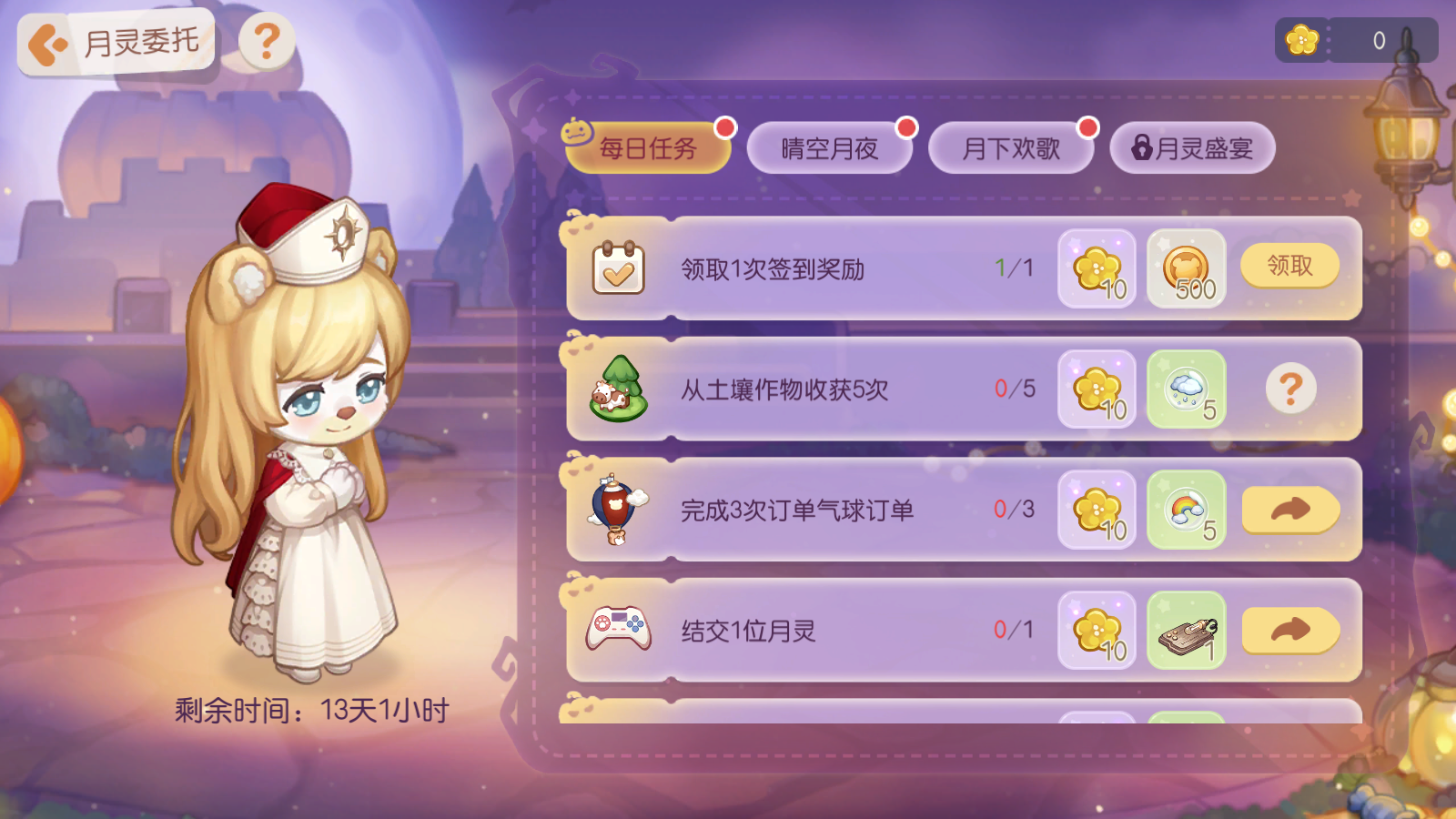 和岛务厅、创造堂一起,协助月灵族完成月灵盛会的准备工作吧!活动期间,完成对应任务即可获得奖励。