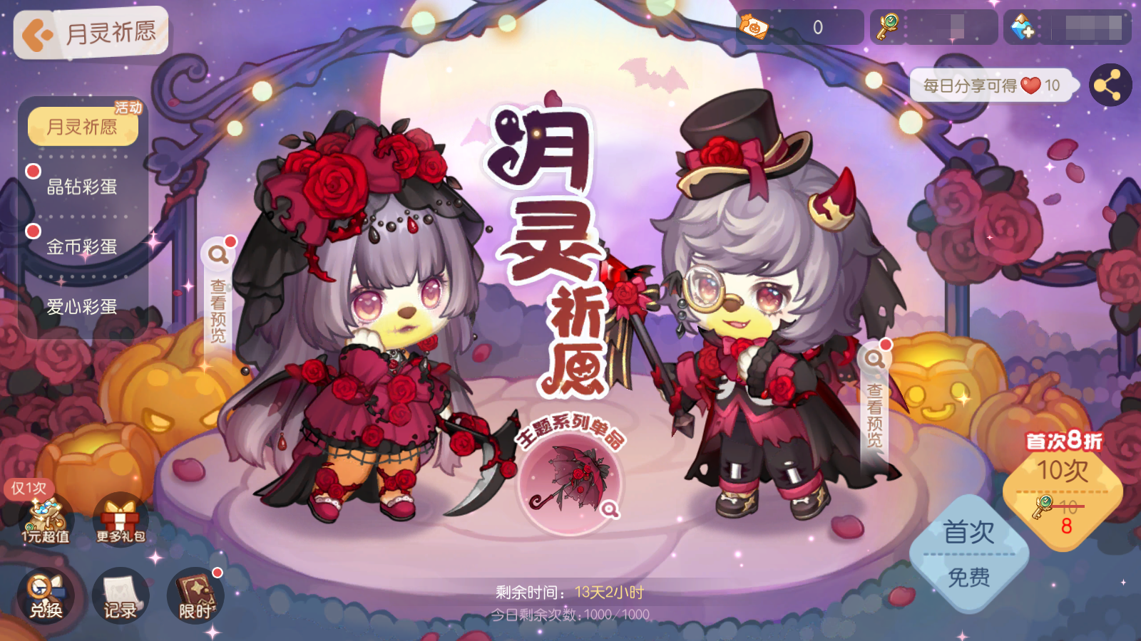 月光润泽大地,月灵逐月而行。月灵盛宴主题彩蛋“月灵祈愿”限时登场!彩蛋上新送福利!从本期彩蛋开始,新彩蛋开启后可免费抽取一次,首次使用时空之钥和晶钻抽取10连还可分别享受一次8折优惠!彩蛋奖励包含晨星品质时装「月夜小夜曲套装」、「月灵夜欢歌套装」以及家具「月灵古堡」系列等全新礼物!还有典藏品质的「月灵物语套装」、「月灵提灯套装」和家具「小迷糊之家」系列、装扮散件「暗夜玫瑰伞」「暗夜玫瑰娃娃」「永不凋零的玫瑰」「玫瑰寄语」等奖励限时获取哦!