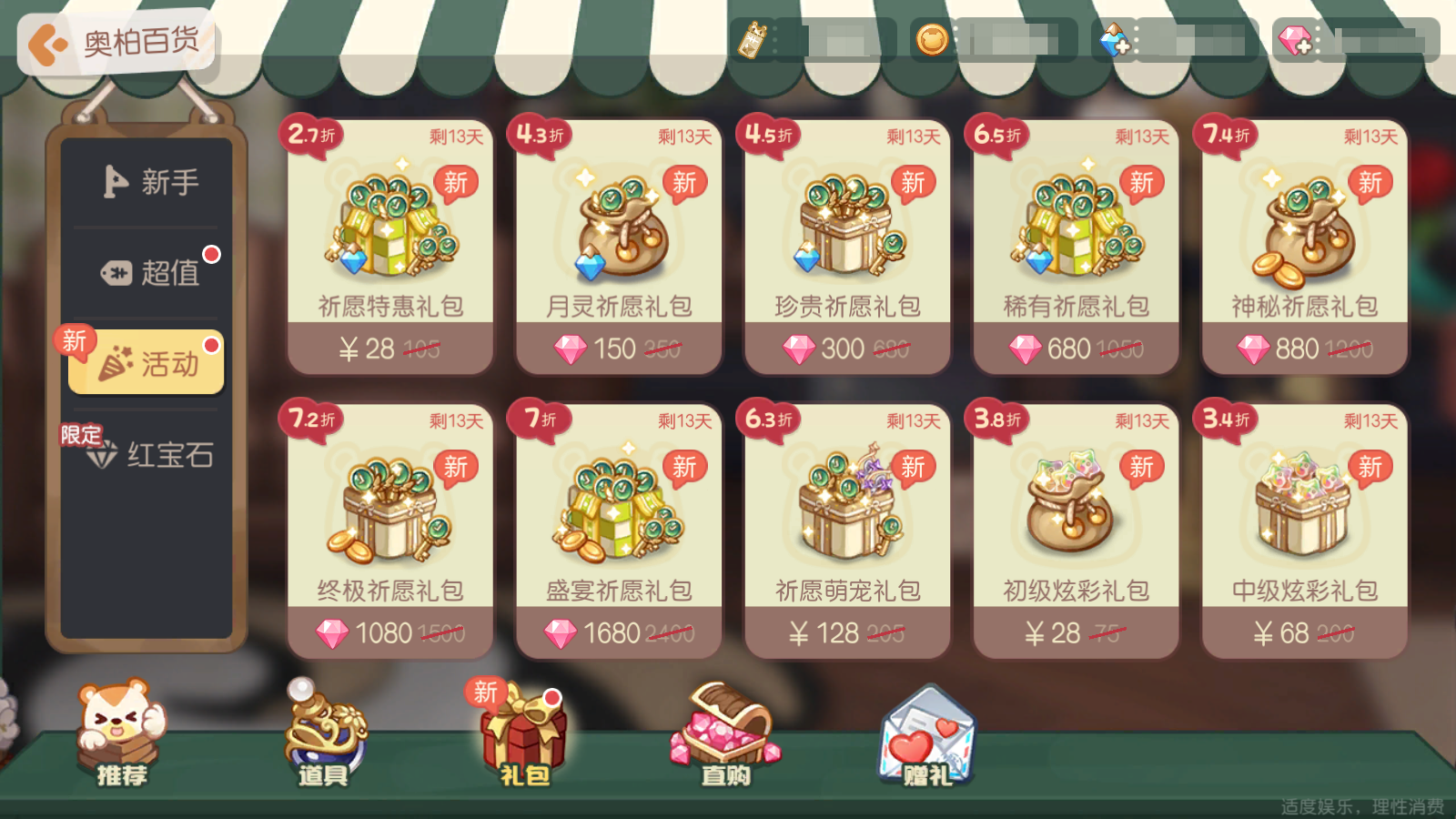 奥柏百货上架全新限时礼包——「祈愿」、「萌宠」系列折扣礼包,限时折扣优惠商品不可错过!