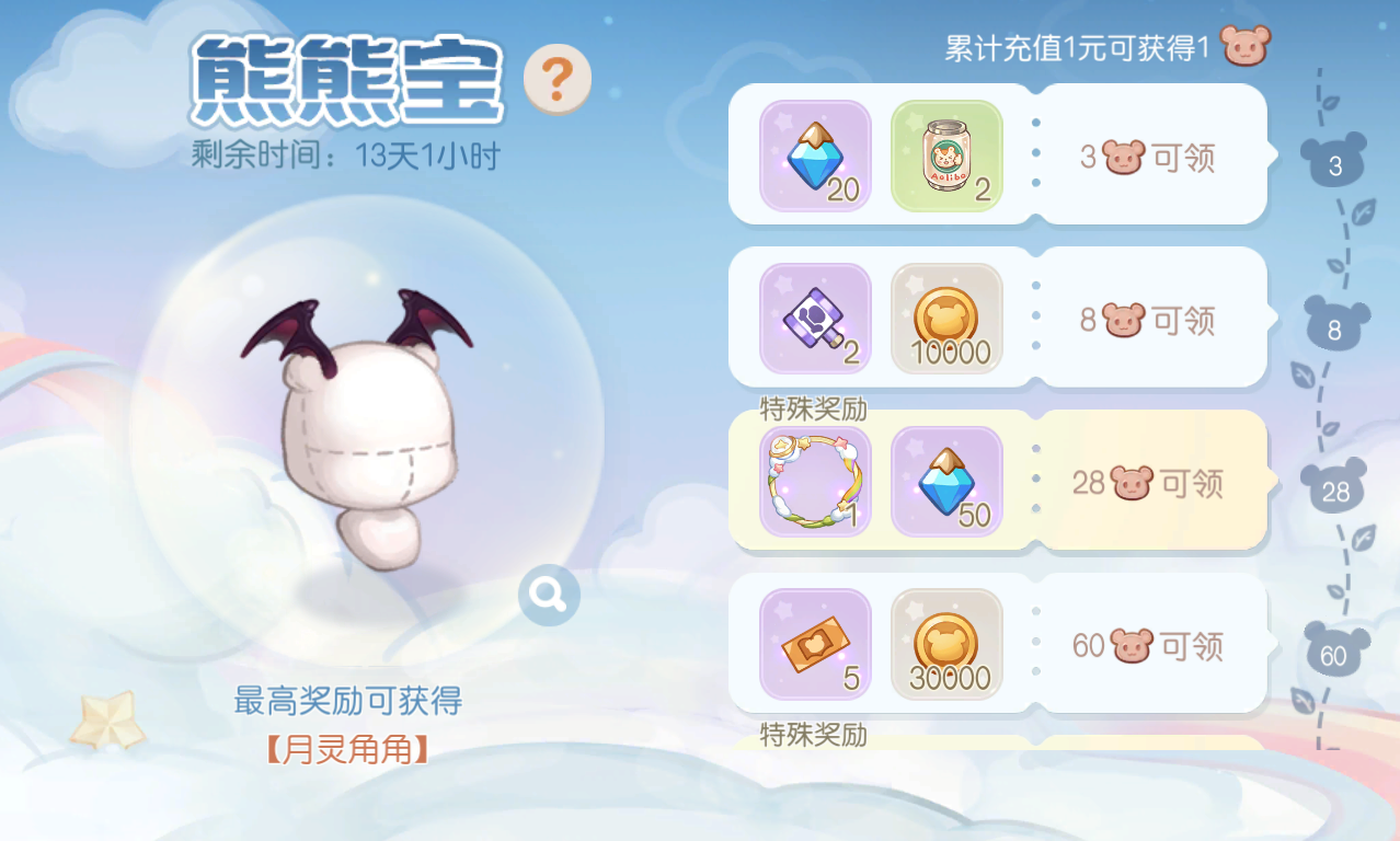 熊熊宝限时回馈活动上新,在活动期间,每往游戏内储蓄1元,即可获得1点小熊积分。当小熊积分达到对应的奖励积分档位时,可解锁对应的进度奖励,丰厚的奖励包括「月灵神秘水池」互动家具、「月光鸣奏曲」称号、「星星花云头像框」、「月灵角角」装扮等,快来参与吧!