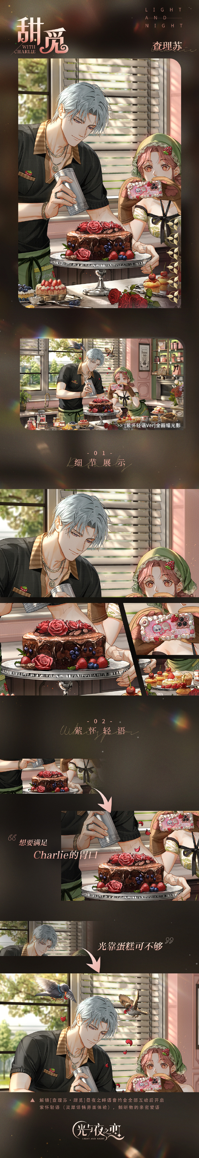[6星]灵犀 查理苏・甜觅 附带剧情为昼夜之畔语音约会,可在【心动邂逅→倾听→余音】处体验。