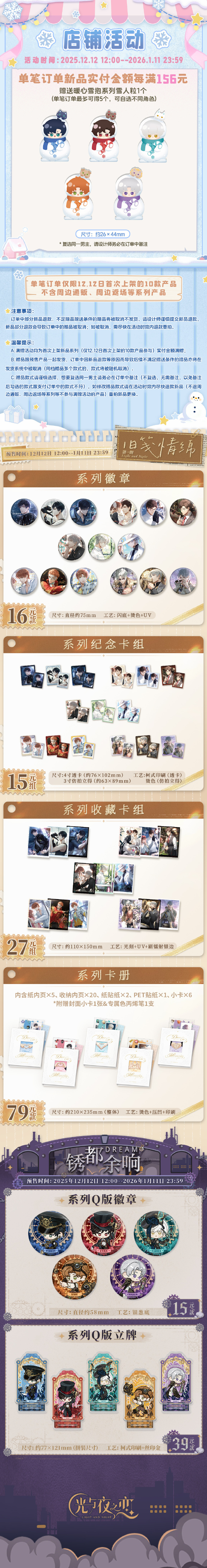 ◆ 单笔订单12.12日首次上架新品系列(仅限暖心雪抱系列4款、旧笺情绵·第一期系列4款和锈都余响系列2款新品)实付金额每满156元赠送暖心雪抱系列亚克力雪人粒1个,单笔订单最多可得5个,可自选不同角色(复选同一男主,请设计师务必在订单中备注)。