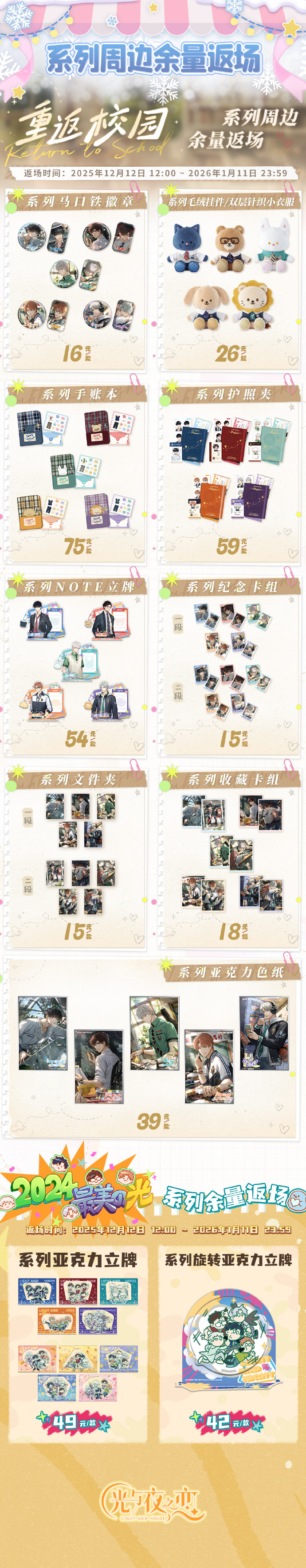 暖心雪抱、旧笺情绵·第一期和锈都余响系列限时周边新品,重返校园和2024最美的光系列余量返场,即将同时开启!