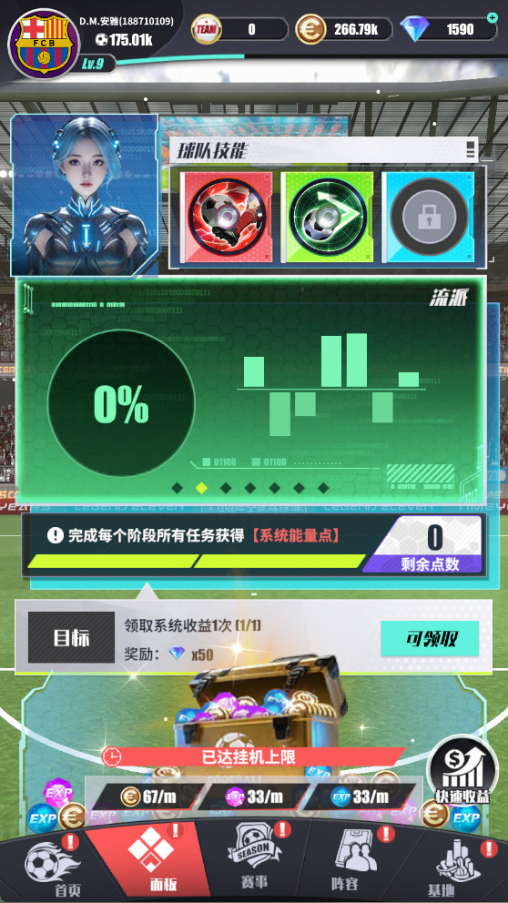 1、面板功能:一面掌控全绿茵,您在这里可以完成任务获取流派点,搭配球队技能,领取球队挂机收益;
