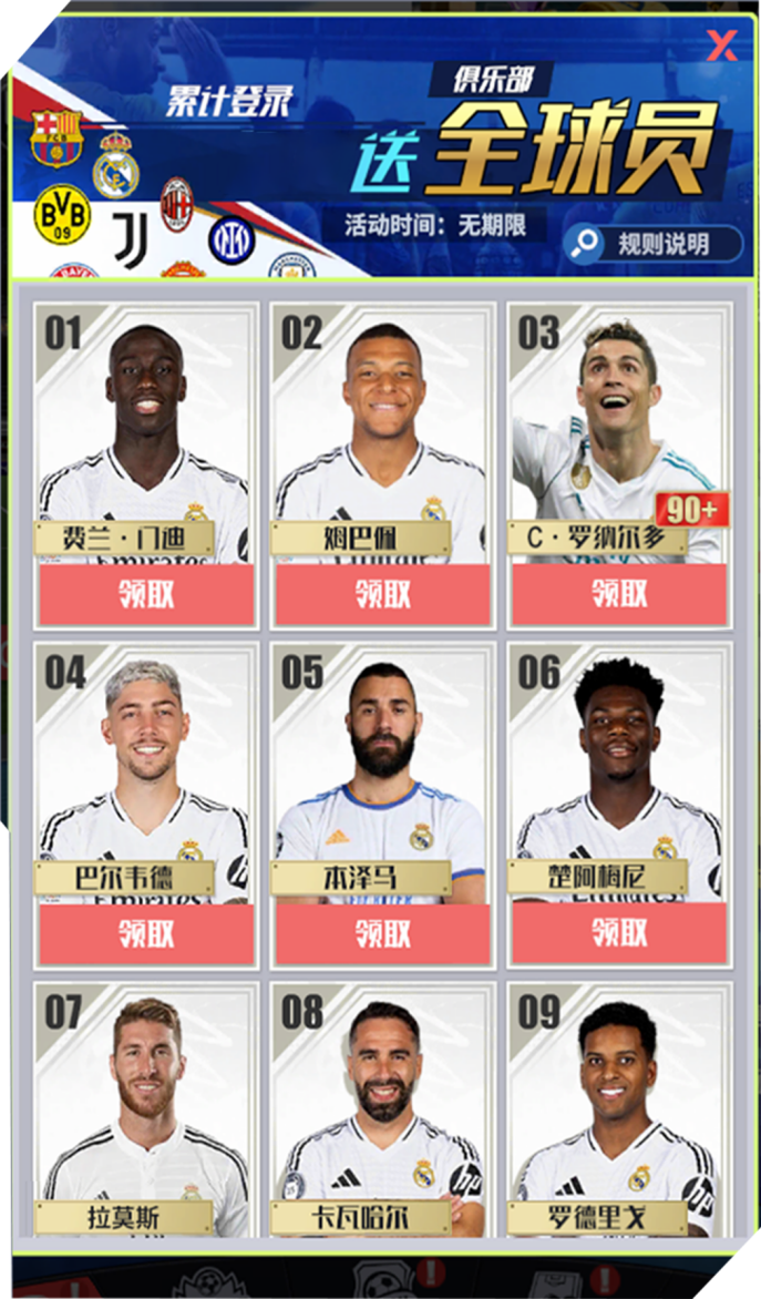 1. 福利活动:1、登录礼包:连续登录即可免费领取心仪俱乐部全球员;
