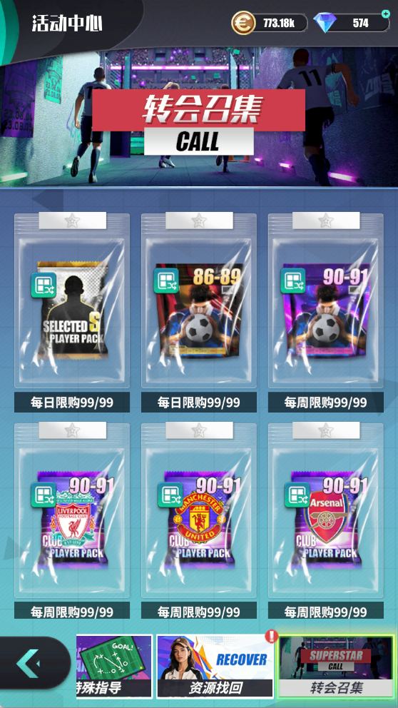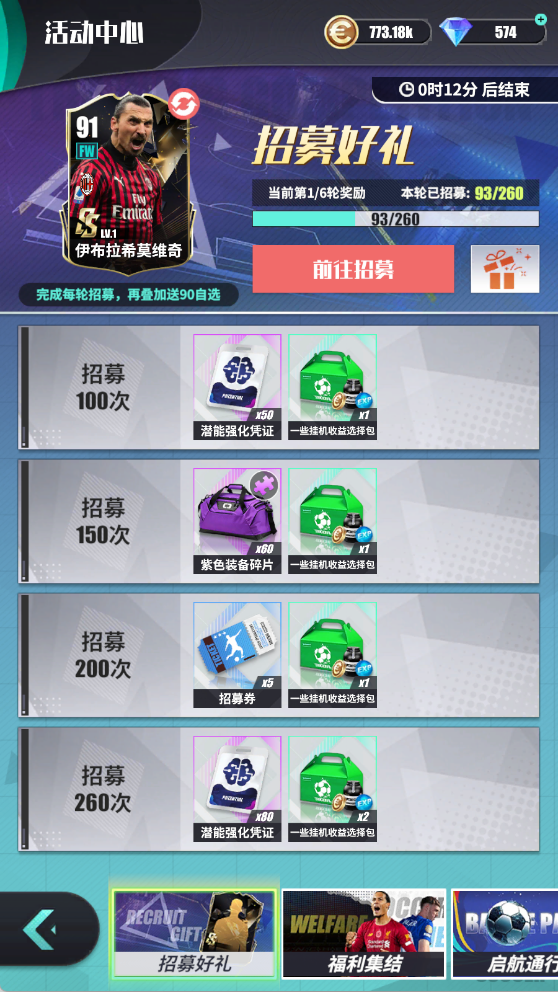 当玩家每招募到一定的次数后,可以前往活动中心的招募有礼中领取招募奖励,每招募260次可以领取一名自选90球员,总共可以招募六轮。