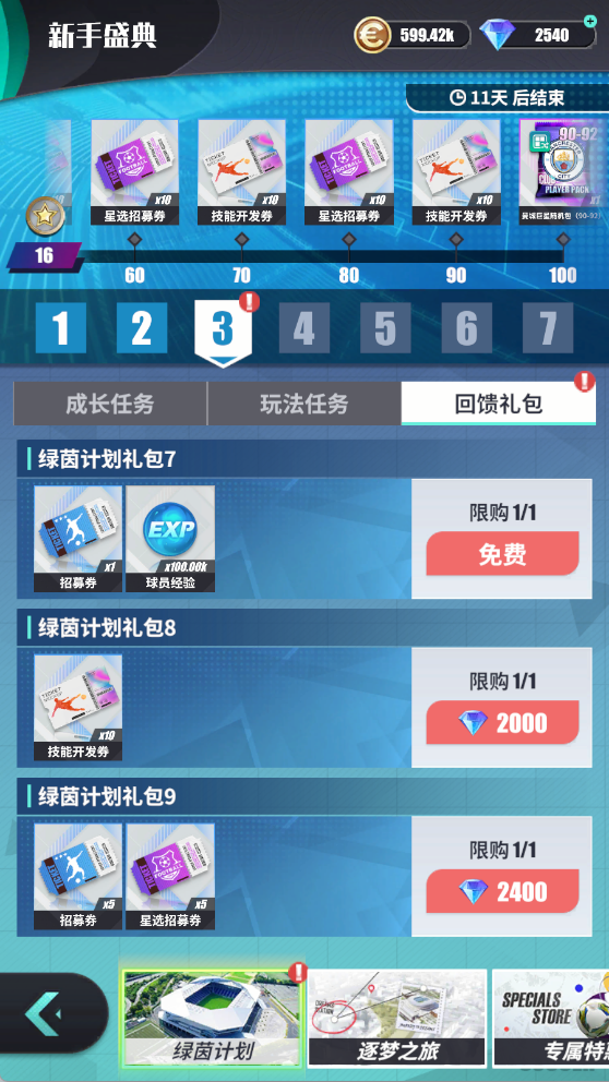 新手期间玩家可以多参与新手盛典中的活动。首先是绿茵计划,玩家可以通过完成成长任务和玩法任务来获得钻石和点数,点数每累计到一定数量可以获得招募券和星选招募券的奖励,当点数到100后可以获得本队的90-92球员随机包。