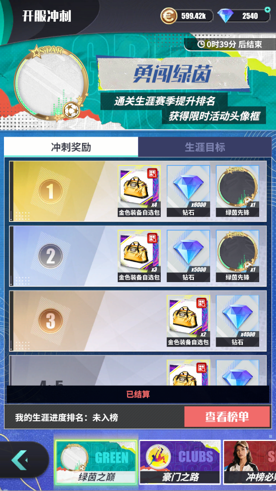 开服冲刺中的绿茵之巅中的冲刺奖励可以获得高品质金色装备自选包和紫色装备自选包,各位玩家可以等开服后多多参与噢。
