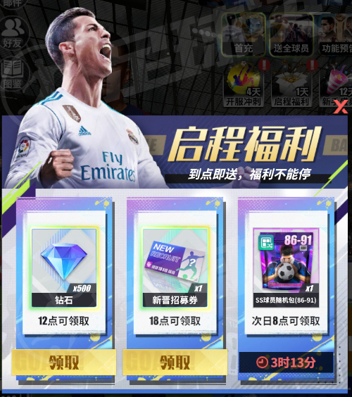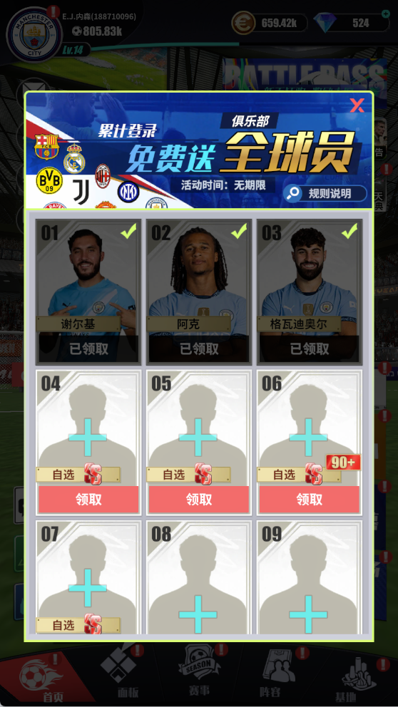 首先是送全球员活动,玩家每天登录即可领取一个本队的SS球员,登录六天就可以获得一个90+SS球员,最多可提前3天选择球员,已被选中的球员不可再其他天再次选择。SS球员是目前游戏中品质最高的球员,获得了即可对球队战力有显著的提升。