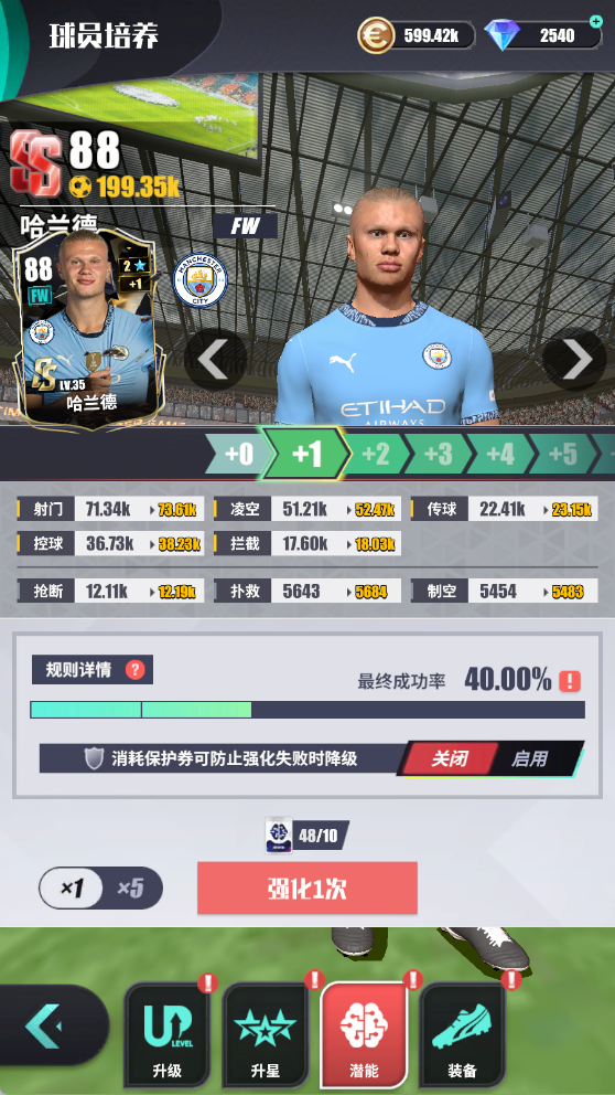潜能为新增加的功能,潜能每强化成功一次,都可以增加球员的各项属性。但每次强化有成功率,强化等级越高,基础成功率越低。强化失败后会降级,并提升下次强化该等级时的成功率。强化是可以启用保护券来防止降级,让强化事半功倍。现在目前潜能强化凭证的主要获得途径是拉练赛和市场中的每日/每周特惠。