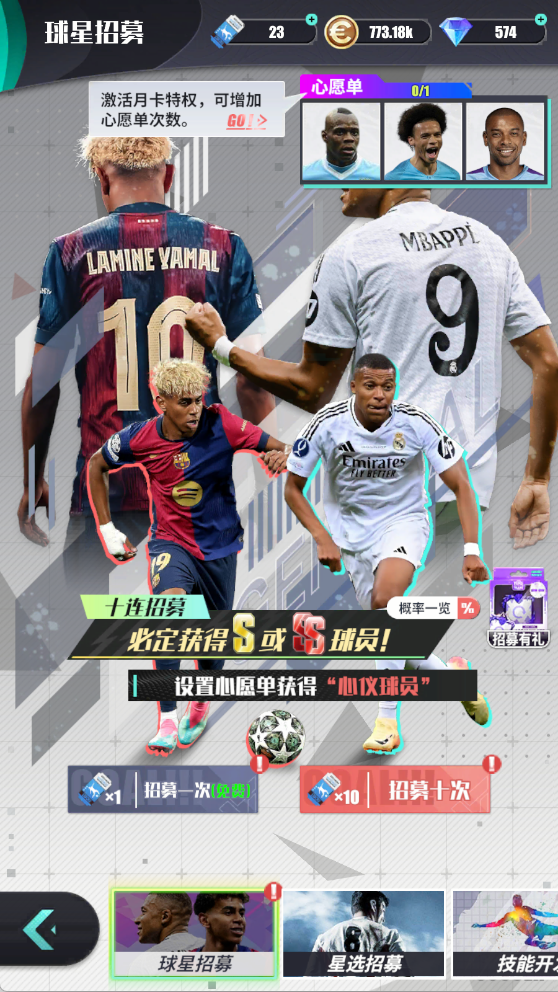 其次球星招募,星选招募和技能开发,分别使用的是普通招募券,星选招募券和技能开发券。三种卡池都有心愿单的功能,可以设置自己想要的球员和技能。特别说明的是,星选招募的卡池内的球员都为同俱乐部球员,这对球员后期高级升星将有非常大的帮助!玩家可以自己切换卡池选择自己想要的俱乐部。