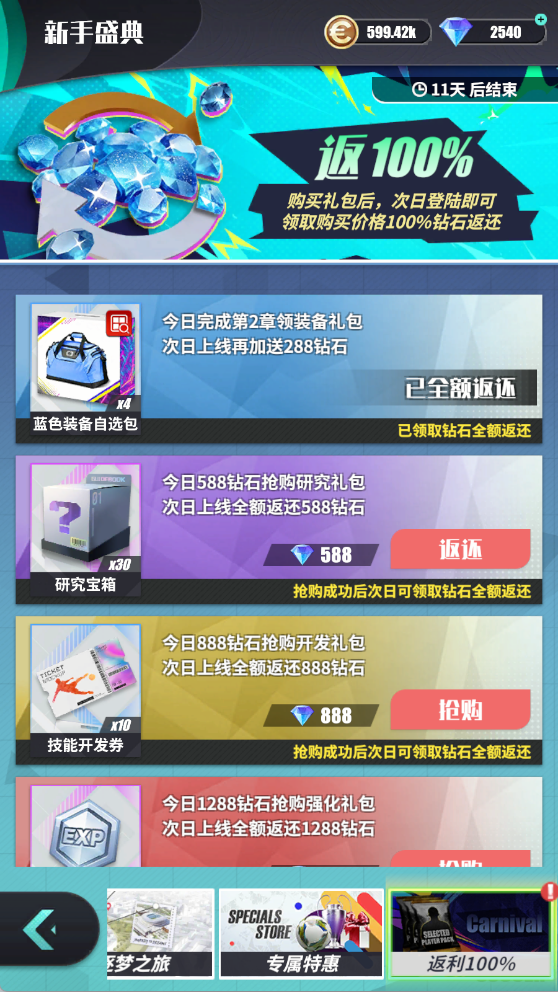 最后是返利100%活动。购买礼包后次日登录即可全额返还所花费的100%钻石。海量道具免费得,千万不要错过哦!
