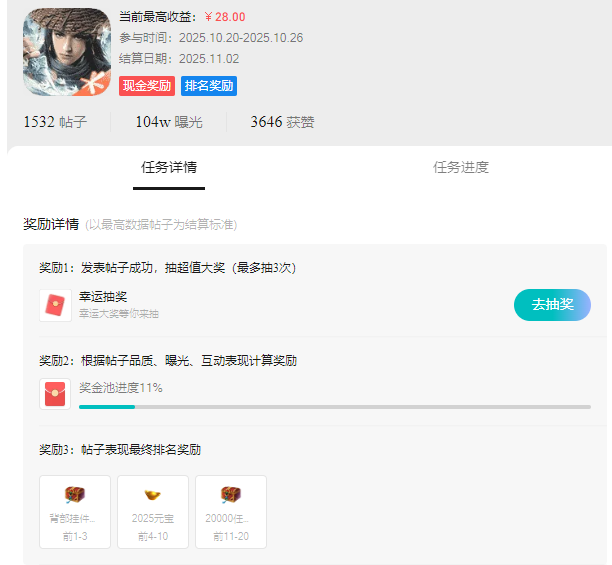 奖励三:排名奖励据帖子的数据表现排名,发放不同奖励。第1-3名:背部挂件任选礼盒(以游戏内打开为准)第4-10名:2025元宝第11-20名:20000真气元气贡献任选箱