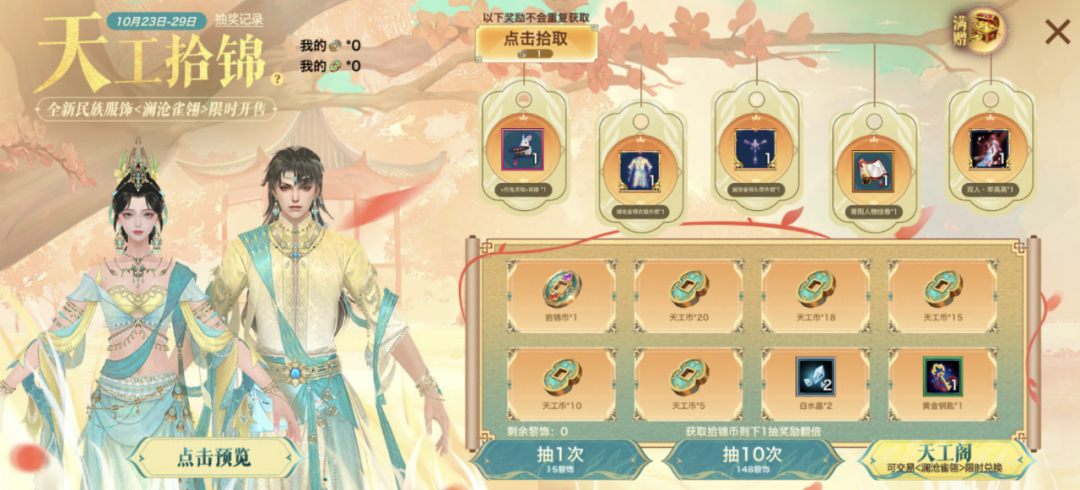 拾锦币可用于抽取奖池B,且每轮抽取奖励不重复(包含本期上新的全新民族主题外装·澜沧雀翎),每次抽取会消耗不同数量的拾锦币。