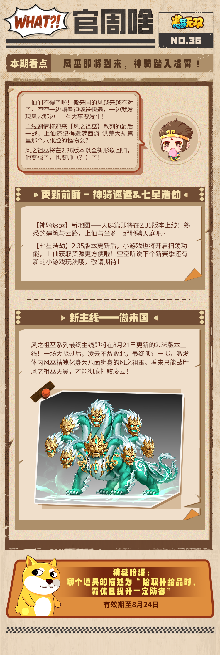 上仙,空空有要事禀报!傲来国忽生异相,暗风盘旋,风穴似有惊天劫数要起!神骑速运开启新篇章,七星浩劫开启扫荡,风之祖巫携八面狮身霸气登场,且看如何破局,还请上仙速速随我观看本期「官周啥」~