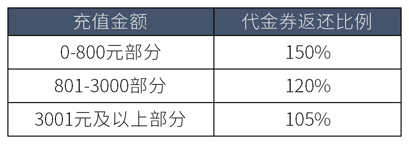 例:充值11元,返还11*1.5=16.5元,将获得等值于17元代金券,即代金券*17。