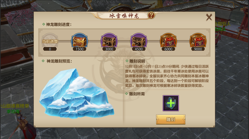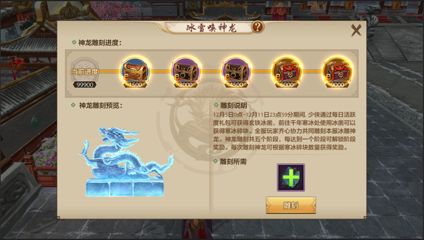 少侠将寒冰碎块交与张天师可增加冰雕神龙雕刻进度,每天的提交次数不限,冰雕神龙雕刻一共分为五个阶段,当雕刻进度达到某一阶段后便能解锁对应阶段奖励,少侠可在雕刻界面点击领取。