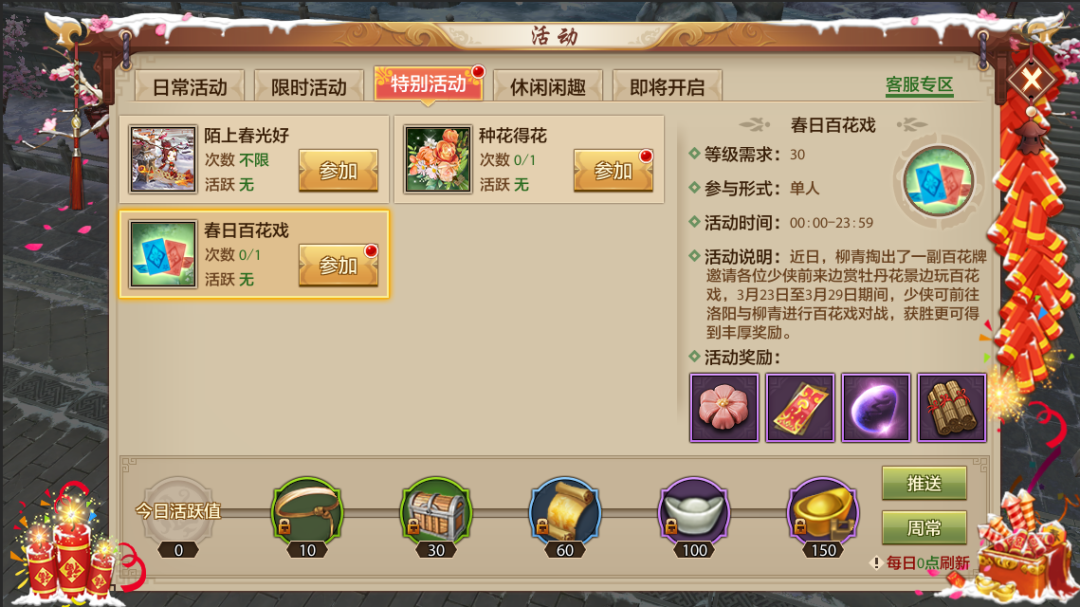 近日,柳青掏出了一副百花牌,邀请各位少侠前来边赏牡丹花景,边玩百花戏!3月23日至3月29日期间,少侠可前往洛阳与柳青进行百花戏对战,获胜更可得到丰厚奖励!