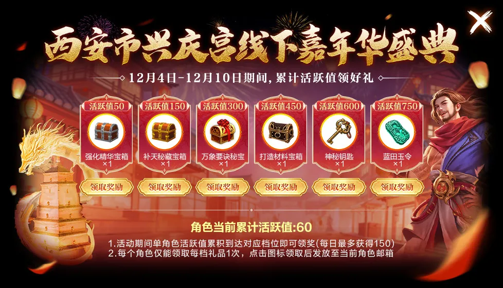 今天除了嘉年华的爆料外,老赵还携游戏中的超值福利而来!在12月4日-12月10日期间,少侠们登录游戏,累计活跃值达到相应的档位,即可轻松领取丰厚奖励。万象要诀秘宝、蓝田玉令等诸多珍贵好礼,正静待着各位少侠前来领取,切莫错过!