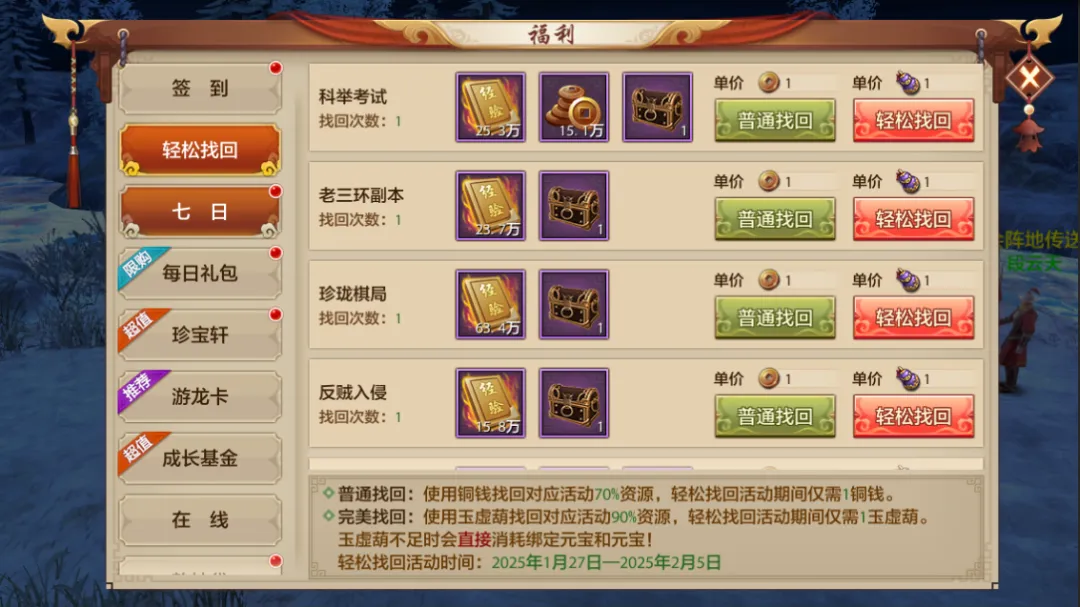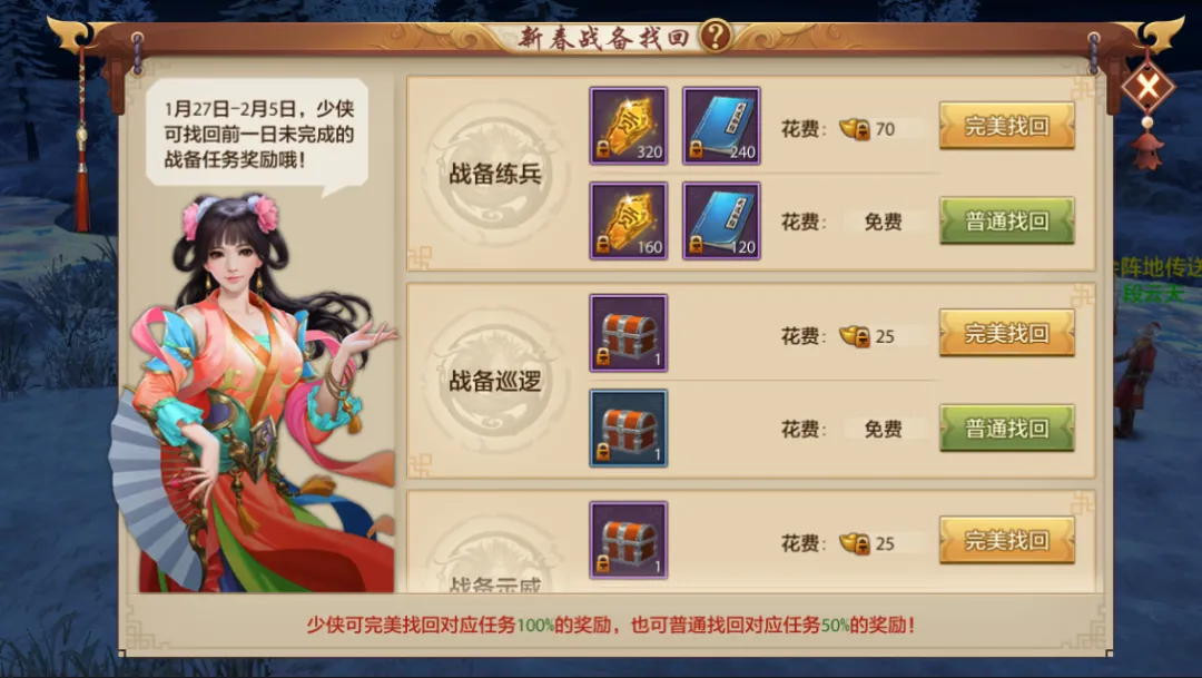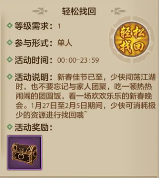 1月27日-2月5日期间,少侠只需消耗1铜钱或者1玉虚葫即可找回前一天未完成的活动奖励哦!限时福利,诸位切莫错过!