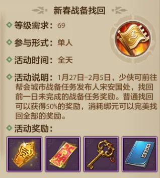 除了活动奖励外,老赵为了能让大家能度过一个轻松愉快的假期,少侠们关心的战备任务奖励也可找回啦。在1月27日-2月5日,等级不低于69级的少侠前往帮会城市战备任务发布人宋安国处,找回前一日未完成的战备任务奖励。