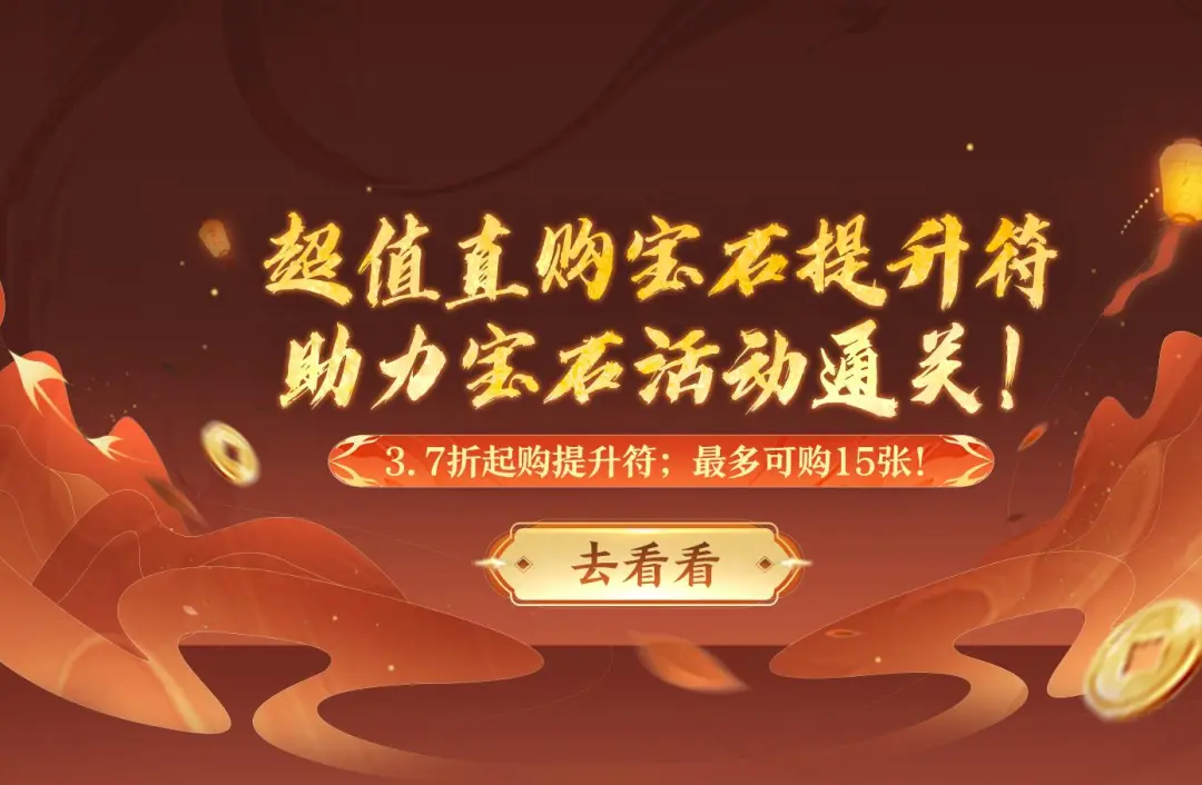 这一档更超值!少侠可先以优惠价购买5张宝石提升符;完成首轮购买后,自动解锁第二轮,再购5张。两轮共10张,助少侠在江湖中稳步进阶!