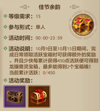 10月9日-10月15日期间,完成日常任务,领取活跃宝箱时,可获额外奖励。并且每累计获得450点活跃值,即可领取龙骧兽灵宝箱一个,每位少侠限量2个哦。