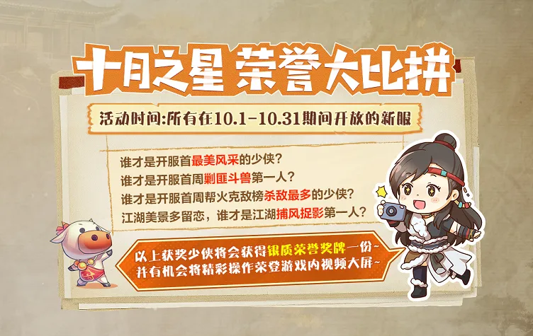与此同时,我们将特别启动“十月之星”荣誉评选。在新服开启的首周,于以下四大领域位居第一的少侠:展现最美风采、剿匪斗兽第一人、位居帮火克敌榜榜首、成为江湖捕风捉影第一人,将分别荣获专属定制纪念证书。以此铭刻少侠在天龙江湖的高光时刻,留存永恒纪念。