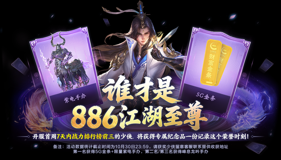 而对于那些志在问鼎江湖的顶尖高手,微信886服和微信888服还将开启江湖至尊。微信886服与888服各自战力排行榜前三名的少侠,均可获得天龙专属纪念品一份。除此之外,第二名、第三名将获得龙吟手办!而荣登榜首的少侠将获得紫电手办以及5g金条豪礼!