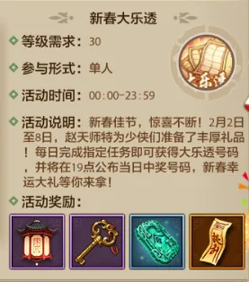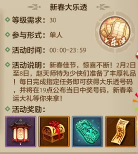 2月2日-2月8日期间,少侠们只需完成每日指定任务,就能轻松获得大乐透奖券,已获得的奖券可一直保留至活动结束,不用担心错过任何一次中奖机会,每日19点准时公布当日中奖号码,每一次开奖都有新期待,重磅惊喜大礼静候各位少侠前来解锁!