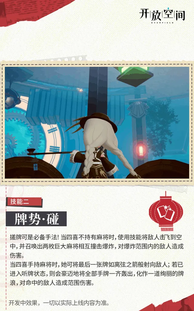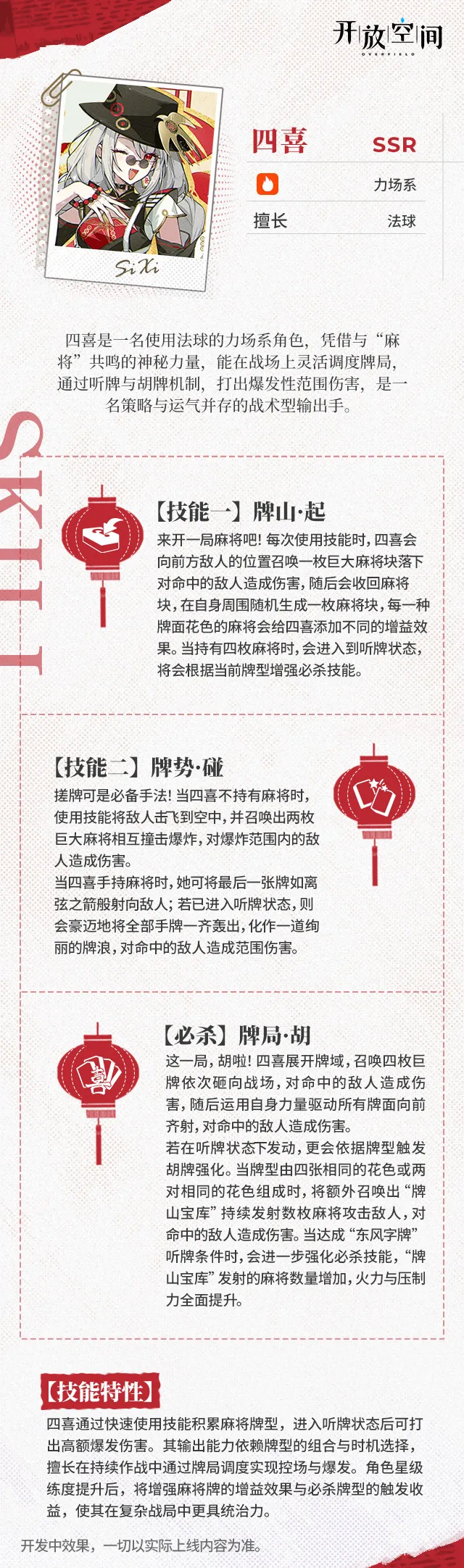 四喜是一名使用法球的力场系角色,凭借与“麻将”共鸣的神秘力量,能在战场上灵活调度牌局,通过听牌与胡牌机制,打出爆发性范围伤害,是一名策略与运气并存的战术型输出手。