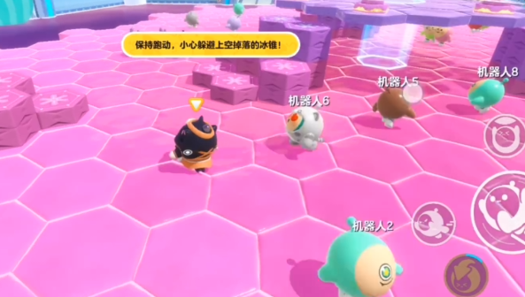 在场地中还会刷新一些道具,其中弹板非常实用。由于粉红区域只有一层,使用弹板可以快速跳跃到安全区域,甚至能帮助你避开连续的冰锥攻击。熟练运用弹板,往往能在关键时刻救你一命。