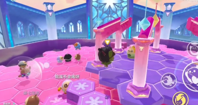 在冰锥降落前,空中会出现一道淡淡的蓝色透明光柱,用来提示即将被攻击的区域。在光柱出现但还没有落地的这段时间,该区域暂时是安全的,但一旦光柱开始闪烁,就代表冰锥即将落下,必须立刻离开这个位置。粉红色的地面只有一层,一旦被击穿就会直接暴露在危险中,而下方的紫色地面则是第二层结构,即使被击穿也不会立刻掉落,能为大家争取一些反应时间。此外,地图中还有一些台阶区域,这些地方结构更厚,不容易被一次击穿,是相对安全的停留点。