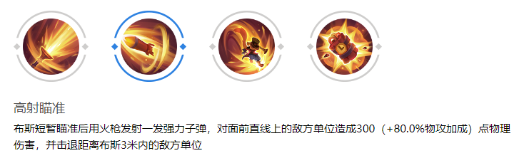 他的一技能“高射瞄准”是主要的消耗与控制手段。布斯会短暂瞄准后发射一枚强力子弹,沿着直线对路径上的所有敌方单位造成物理伤害,并将命中的敌方英雄击退。这一技能不仅具备不俗的伤害,更拥有关键的控制效果,可以在团战中打断敌方技能释放,或是将突进的刺客推开,保护自身与后排。在对线期,利用这一技能进行远程消耗,往往能让对手难以招架。同时,它也是清兵和压制走位的重要工具,帮助布斯在前期建立优势。