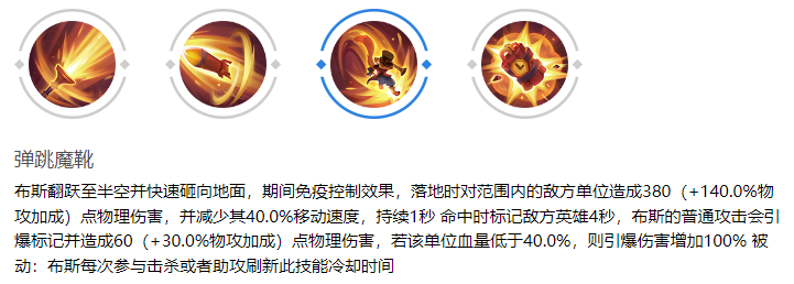 二技能“弹跳魔靴”则是布斯的生存与爆发核心。他跃向空中,在短暂滞空期间免疫所有控制效果,随后砸向地面,对范围内的敌人造成伤害并减速。这一跃起的动作不仅是一个位移技能,更是一道“免控护盾”,在关键时刻可以规避眩晕、击飞等致命控制,极大提升了布斯的生存能力。落地后,若命中敌方英雄,会为其附加一个“引爆标记”,布斯的下一次普通攻击将触发额外伤害。更令人畏惧的是,当目标生命值低于40%时,这一引爆伤害将直接翻倍,堪称斩杀利器。更强大的是,该技能的被动效果规定:只要布斯参与击杀或助攻,技能冷却时间便会立即刷新。这意味着在连续团战中,他能频繁使用这一技能进行突进、逃生或收割,展现出极强的持续作战能力。