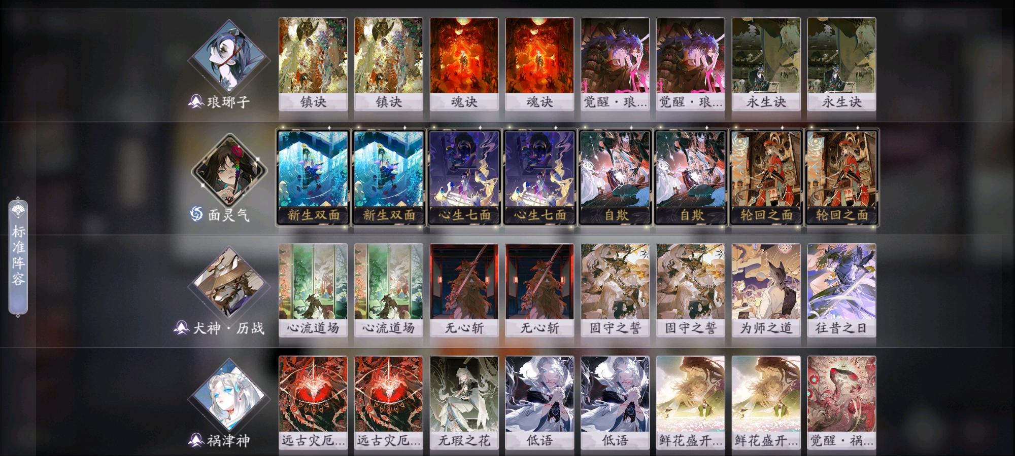 阵容名: 琅琊子 魂诀 (2) 觉醒·琅琊子 (2) 永生诀 (2) 镇诀 (2) 面灵气 新生双面 (2) 心生七面 (2) 自欺 (2) 轮回之面 (2) 犬神·历战 往昔之日 (1) 心流道场 (2) 无心斩 (2) 固守之誓 (2) 为师之道 (1) 祸津神 觉醒·祸津神 (1) 远古灾厄之宴 (2) 无瑕之花 (1) 低语 (2) 鲜花盛开之地 (2) 阵容码:Ml8xMDFfMTAyMjY1NDlfMTc0MDgxNzg2MHx6eAAAAgAAAAZFAQAKRQEAEkUBABpFAQBh7gMARu4DAE3uAwBW7gMAWu4DAGHIAQBOyAEAUsgBAFbIAQBZyAEABsEDAArBAwASwQMA/sADAA== 异画:engAAFm/HwBZvx8A 如果想要使用此阵容,可将阵容码复制到剪贴板,然后在“新建阵容”里点击“使用阵容码”进行粘贴。
