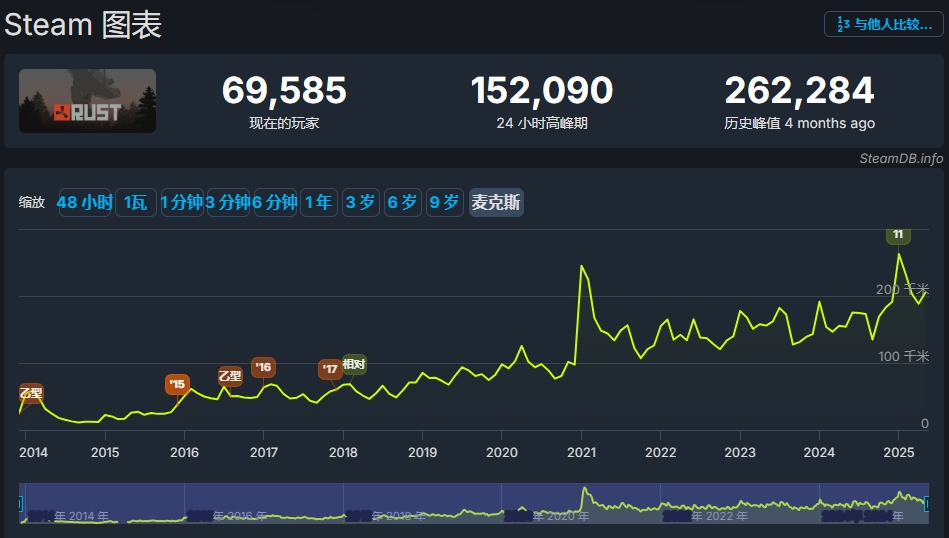 也正是在这时,在海外运营许久,早已经历市场验证的“搜打抢”玩法,吸引了《七日世界》的注意。同赛道的《RUST》发售的成功早已得到验证,并且至今依旧保持着强劲的用户黏性。