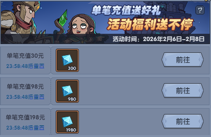 6、限时活动:单笔充值活动期间完成单笔30、98、198元档位充值可以领取高额返利!(仅限30、98、198元档位,其他档位无法满足活动条件哦~)