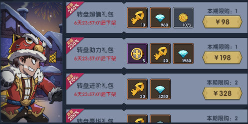 4、商城特惠:转盘礼包超值礼包中限时上架转盘礼包,海量道具材料供应!