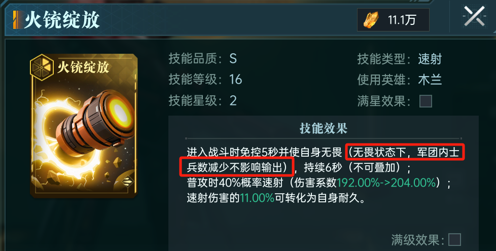 无畏木兰专属机制,可使军团在6 秒内无视兵力减少,保持满属性输出。在爆发对拼或被围攻时,无畏能确保队伍持续打出高额伤害,是速射爆发流的核心机制。