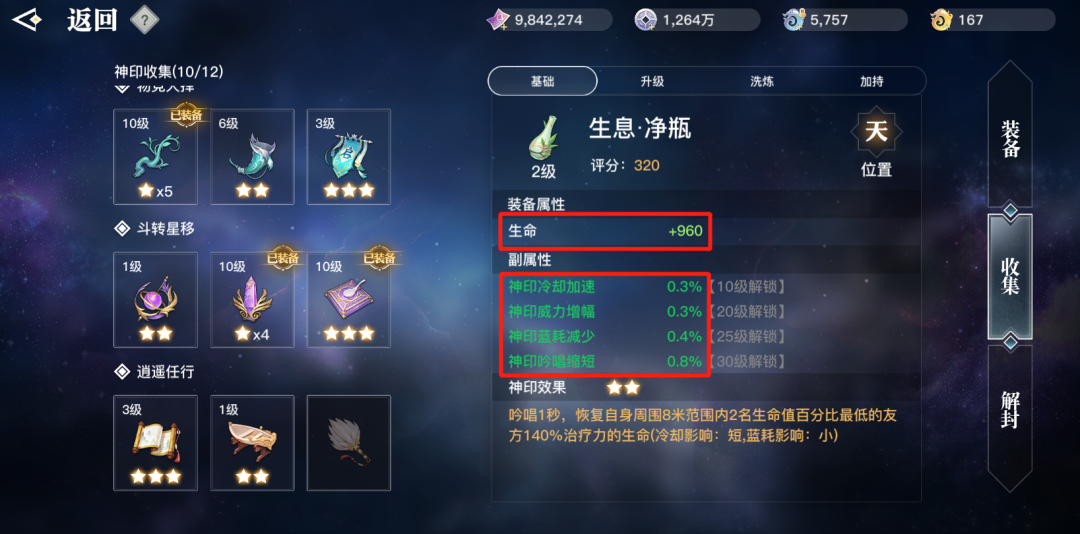 每个神印都有自己的装备属性和4条副属性,其中装备属性根据【天】【地】【人】三个位置来分分别是固定的。