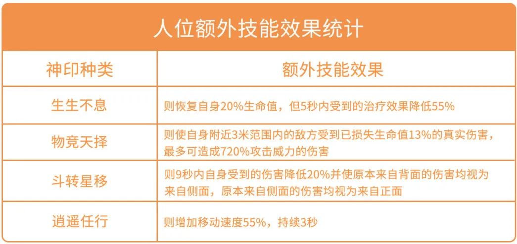 神印系统有三个可装备神印的槽位,分别为【天】【地】和【人】。不同位置装备的不同神印,会对新增的技能产生不同的变化。