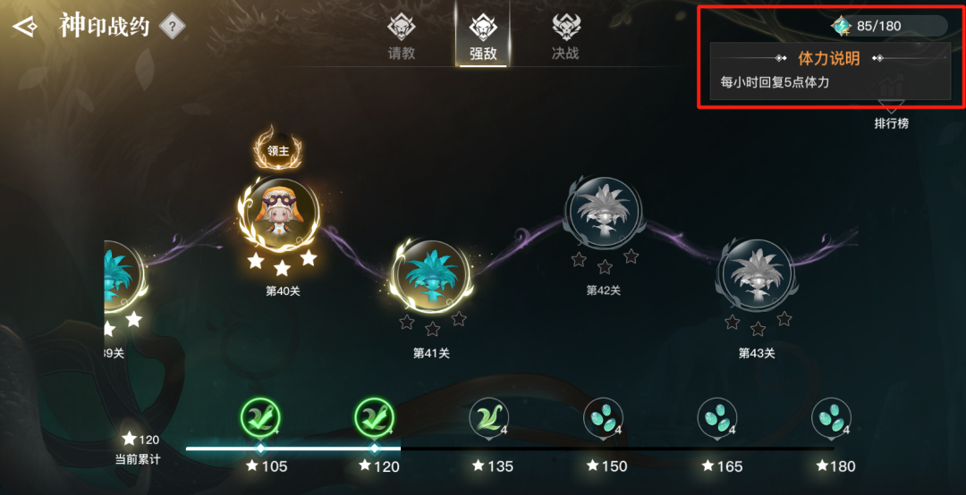 ✨需要注意的是,神印战约每次挑战关卡成功需要消耗20点体力(没有挑战成功则不会消耗体力),而每个小时体力会自动恢复5点。