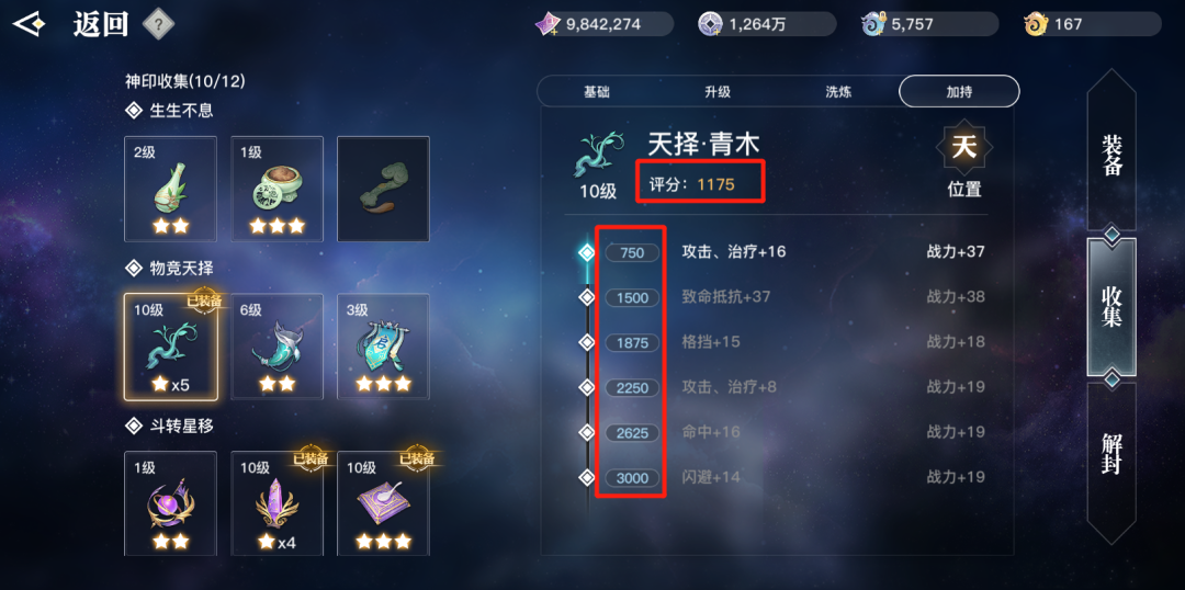 每个神印都有一定的评分。神印的加持就是当我们培养某个神印达到一定评分时就会解锁的属性加持。比如下图中,这个神印评分1175,那么750评分解锁的那一条加持就生效了。