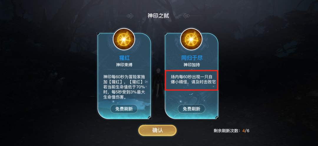 另外,每次进入挑战关卡后,不同难度的副本,敌人获得的增益效果也各不相同,大家有6次刷新关于敌人增益效果的机会,前三次是免费的,但是后三次就需要花费绑玉了,大家可以酌情考虑。