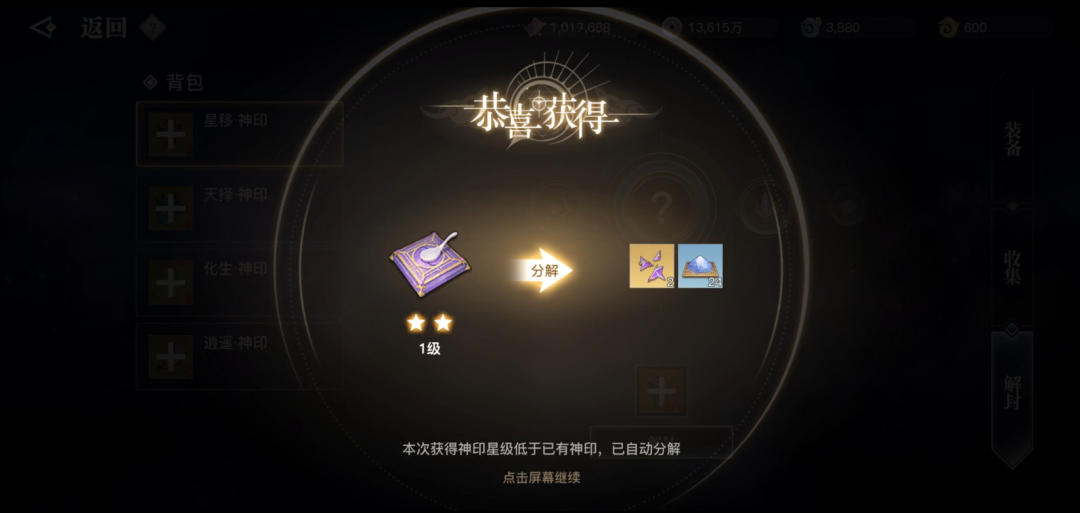 2、召唤低于已有的神印星级的神印,会直接分解,分解材料数量与解封神印星级有关。如果召唤出的神印星级高于已有的,则会直接替换。