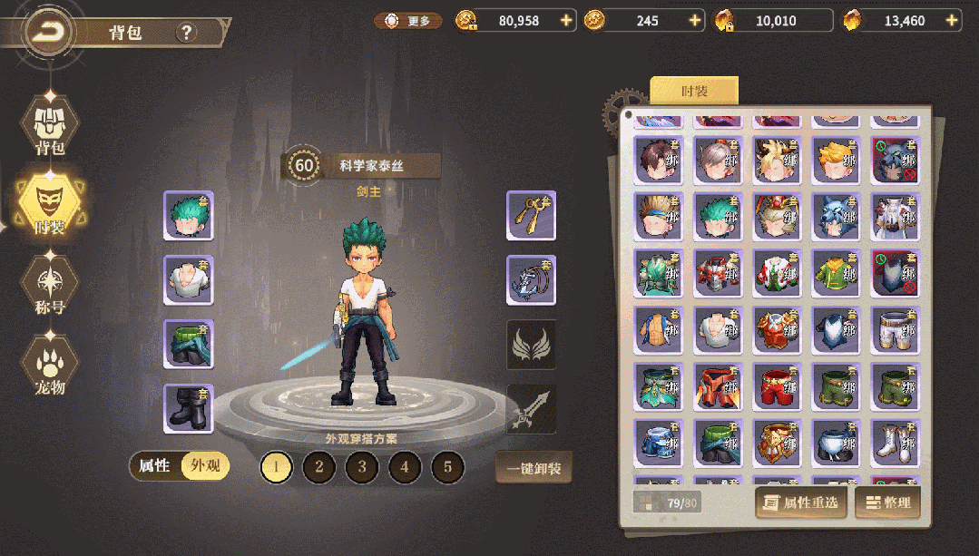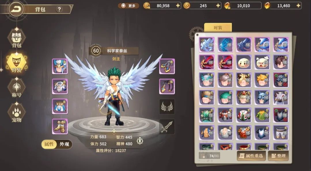 「属性」页签中,我们可以看到冒险家穿戴时装后的四维属性和装备评分。