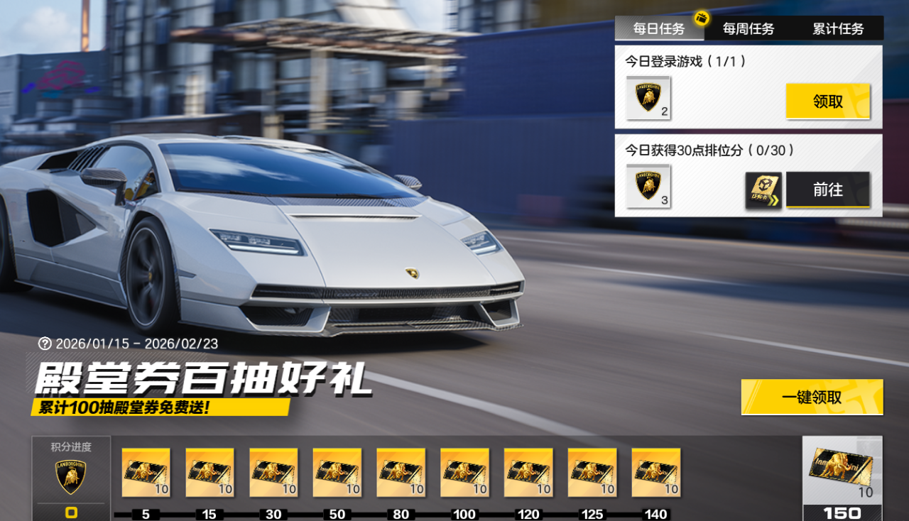 殿堂券百抽好礼将延期至2月23日结束,还没把积分攒满的赛车手,赶紧抓住最后机会!