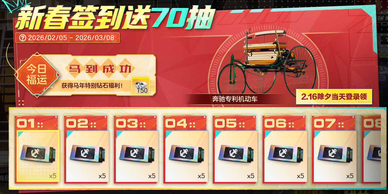 每日登录游戏签到即可领取限时货运券,累计可获取70张。同时每天还可额外抽取今日福运事件,完成福运事件任务即可领取对应奖励。2月16日(大年三十)当天登录,还可直接领取全新奔驰专利机动车。