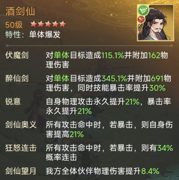 酒剑仙放7号位,在试炼中打高分必选伙伴之一,酒剑仙上阵触发自身被动“剑仙望月”给己方全体伙伴提升8.4%物理伤害的同时,进一步提高我方伙伴(暮菖兰、南宫煌·赤炎妖狼、姜婉儿所造成的伤害)绝技“醉仙剑”对单体目标造成高额伤害,且使用绝技时,技能暴击率提升30%,所有攻击命中时,若暴击,则有34%概率连击,放在7号位,前期和同列伙伴全程对玄霄造成伤害(收益最大化),绝技则需姜婉儿/紫萱眩晕玄霄,确保玄霄在第三回合绝技概率打在酒剑仙身上提供安全保障。